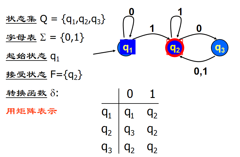 使用五元组定义:M = (Q, Σ, δ, q0, F)