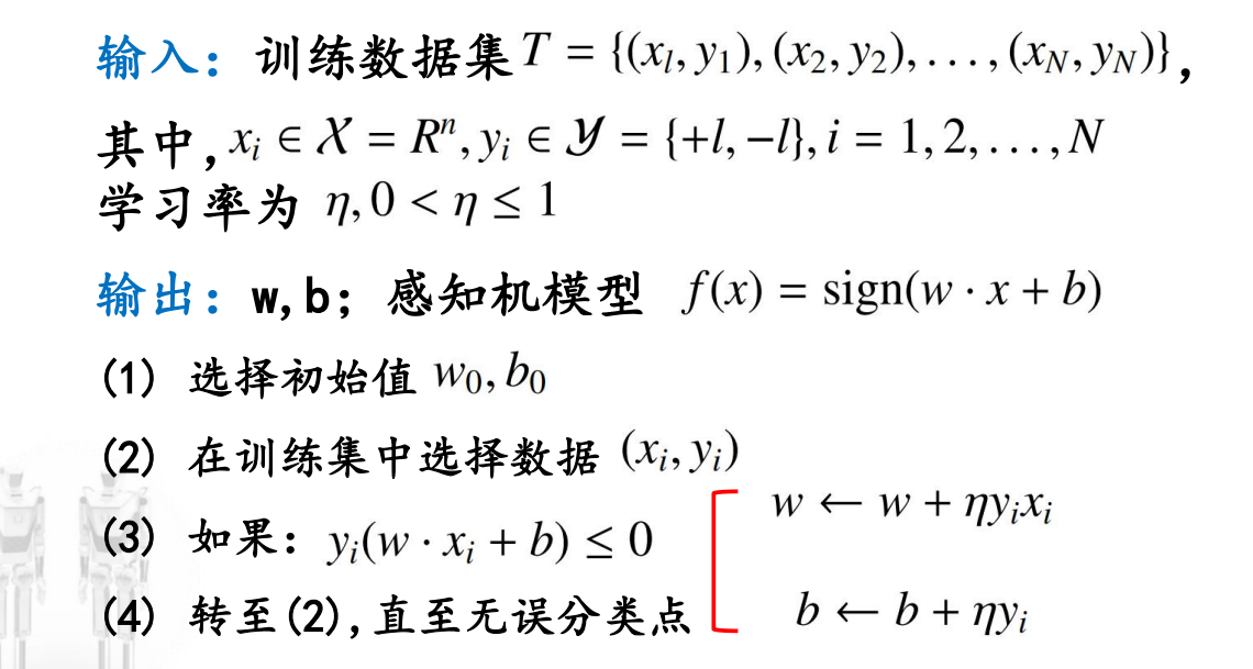 二类分类的线性分类模型,输入为实例的特征向量,输出为实例的类别,取+1和-1二值。